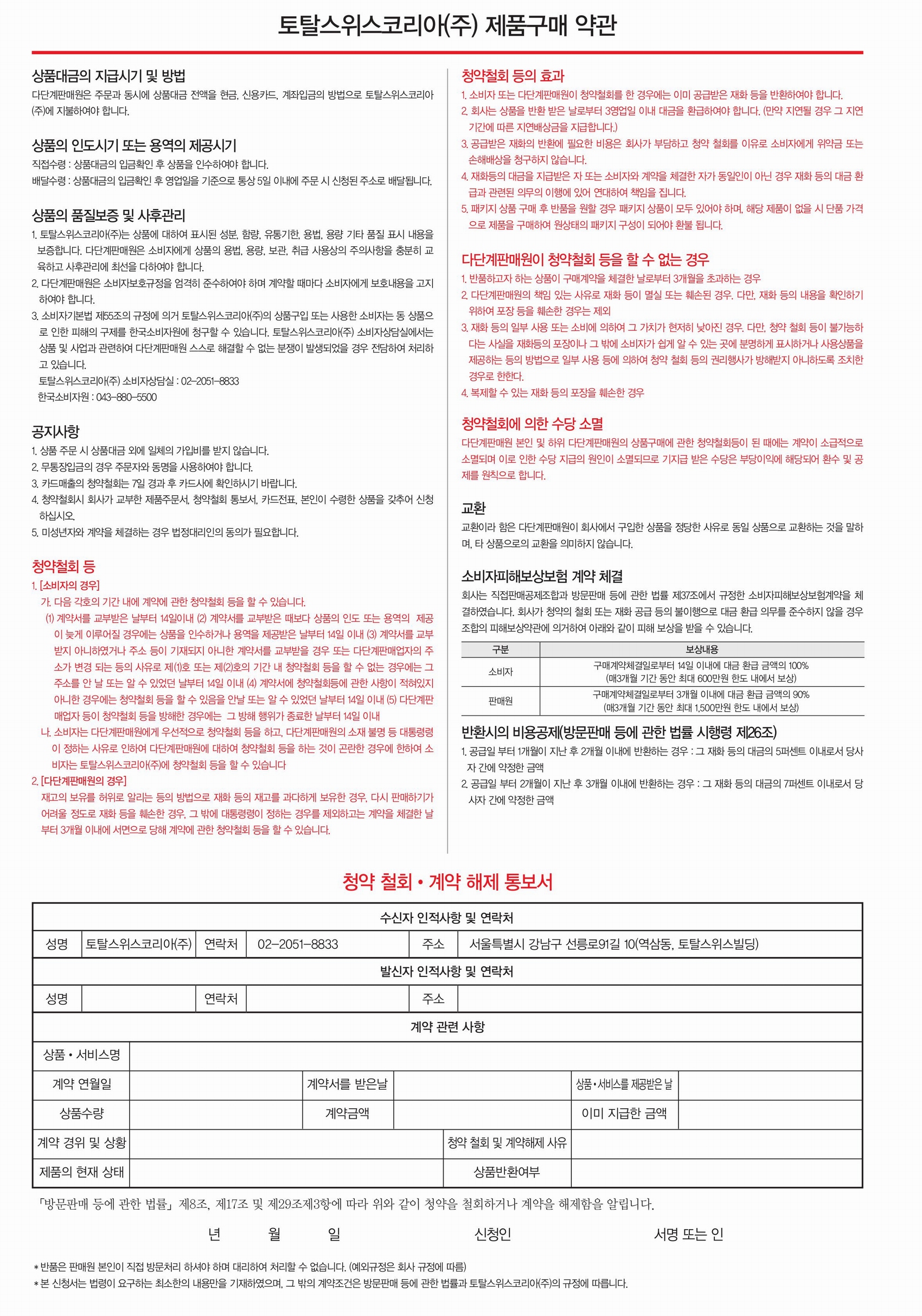 1. 토탈스위스코리아(주)는 상품에 대하여 표시된 성분, 함량, 유통기한, 용법, 용량 기타 품질 표시 내용을 보증합니다. 다단계판매원은 소비자에게 상품의 용법, 용량, 보관, 취급 사용상의 주의사항을 충분히 교육하고 사후관리에 최선을 다하여야 합니다.